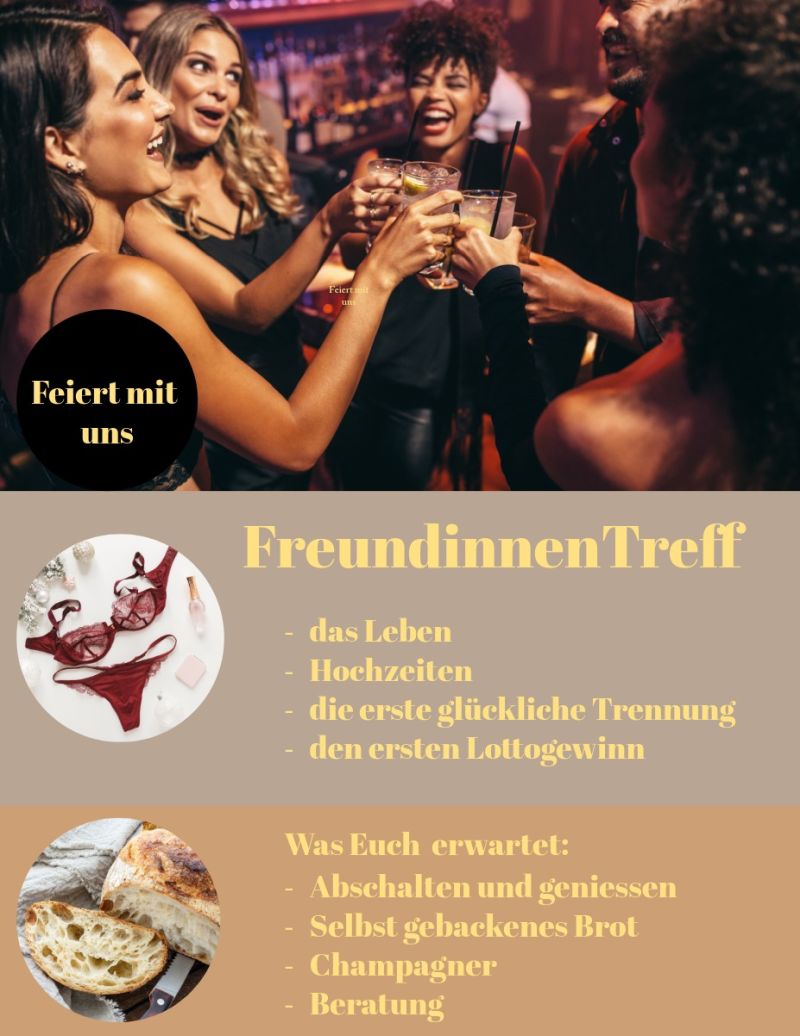 Ihr trefft Euch mit bis zu fünf weiteren Frauen (beste Freundin, liebste Bekannte, sympathische Kollegin - wie auch immer) nach Laden-Schluss (also Mo-Fr ab. 18.00 Uhr, Sa ab 14.00 Uhr) bei uns im Geschäft. Wir machen es uns gemütlich mit Häppchen und Schampus und toller Musik. Jedes Mädel hat eine eigene Kabine für sich. Und dann wird ganz entspannt und nach Herzenslust aus unserem Sortiment ausgewählt und anprobiert.